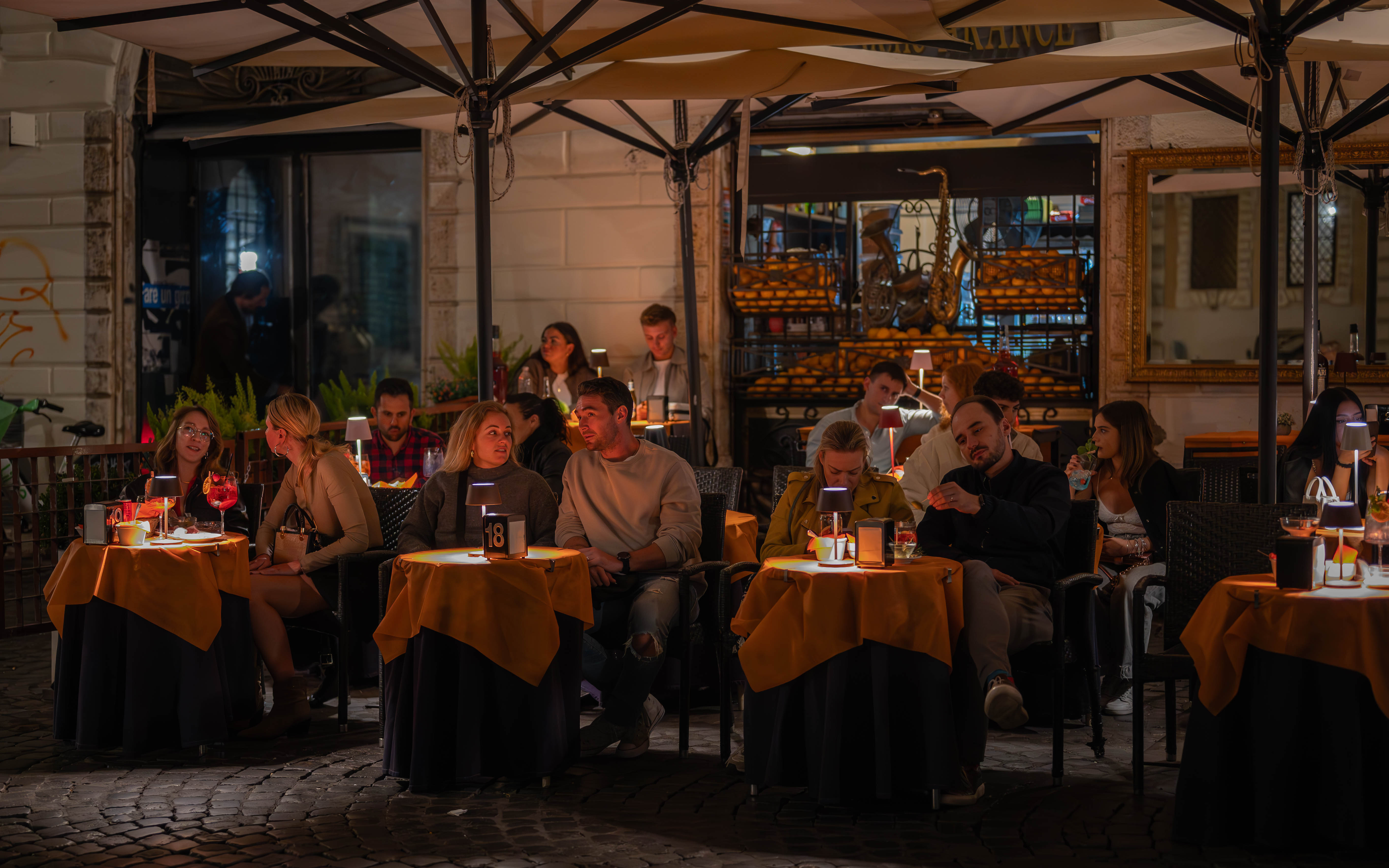 1. Underbart mys. Lagom varmt, avslappnade par, trivsamt ljus. Några sitter ändå och försjunker i sina mobiler. Jättefint foto.