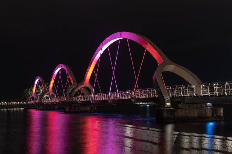 Sölvesborgbron är belyst av led-ljus, som just den här kvällen skiftade mellan rött och blått (ibland är det andra färger). Själva belysningen sitter i nederänden av stagen som går uppifrån bågarna. På bild 50 syns en del av ett sådant stag och de röda strecken är regn, som färgades av led-ljuset. Det blåste lite också, så en del av regnet går på tvären.