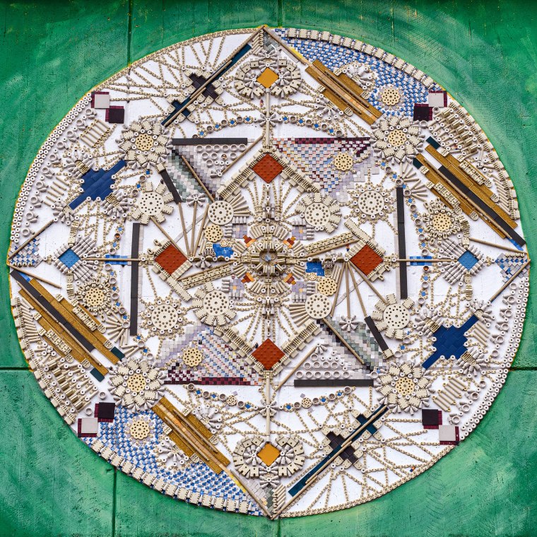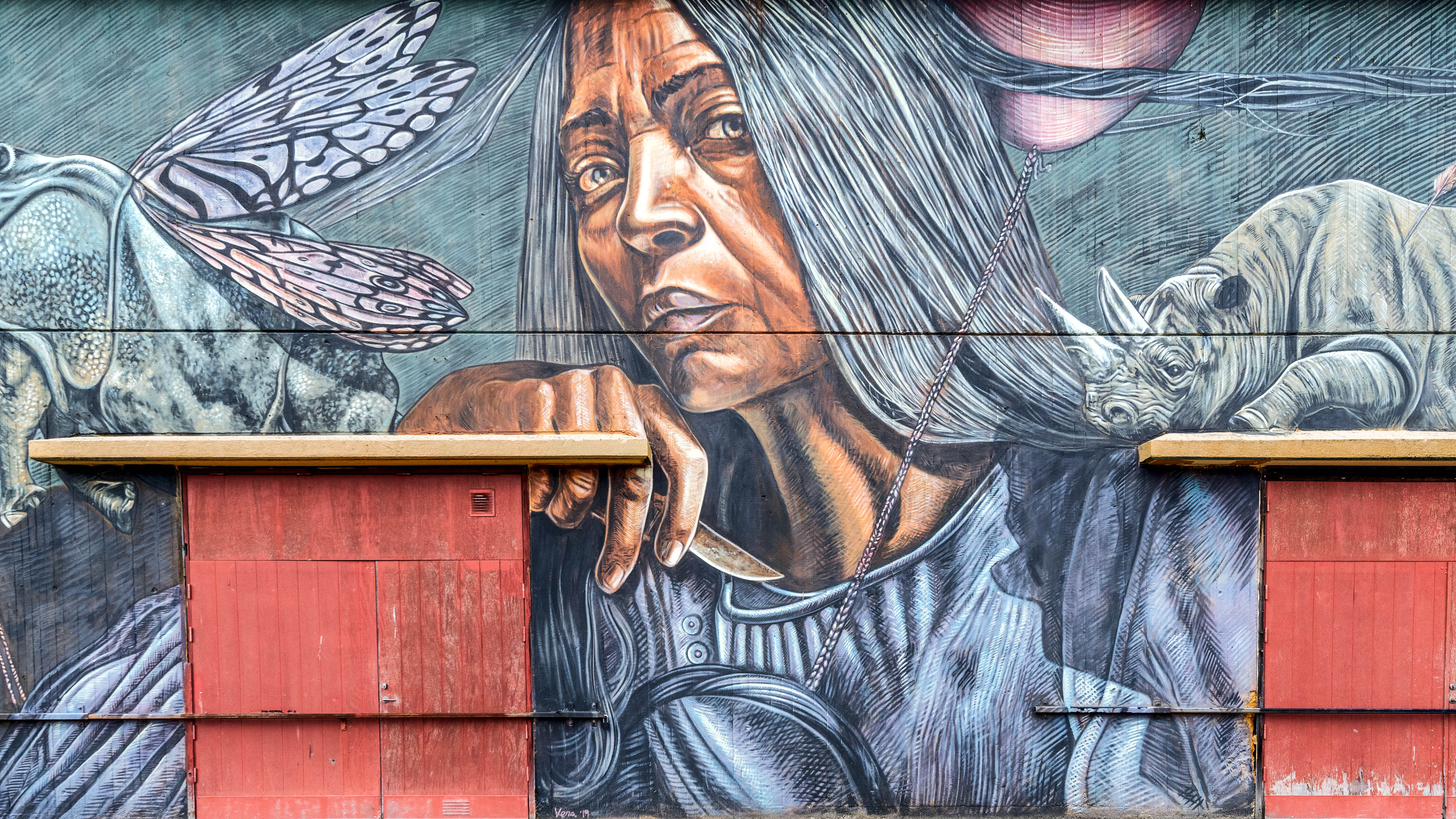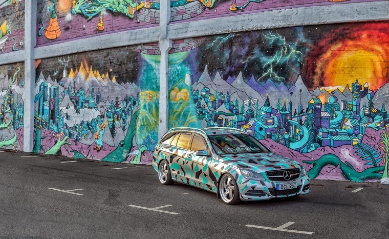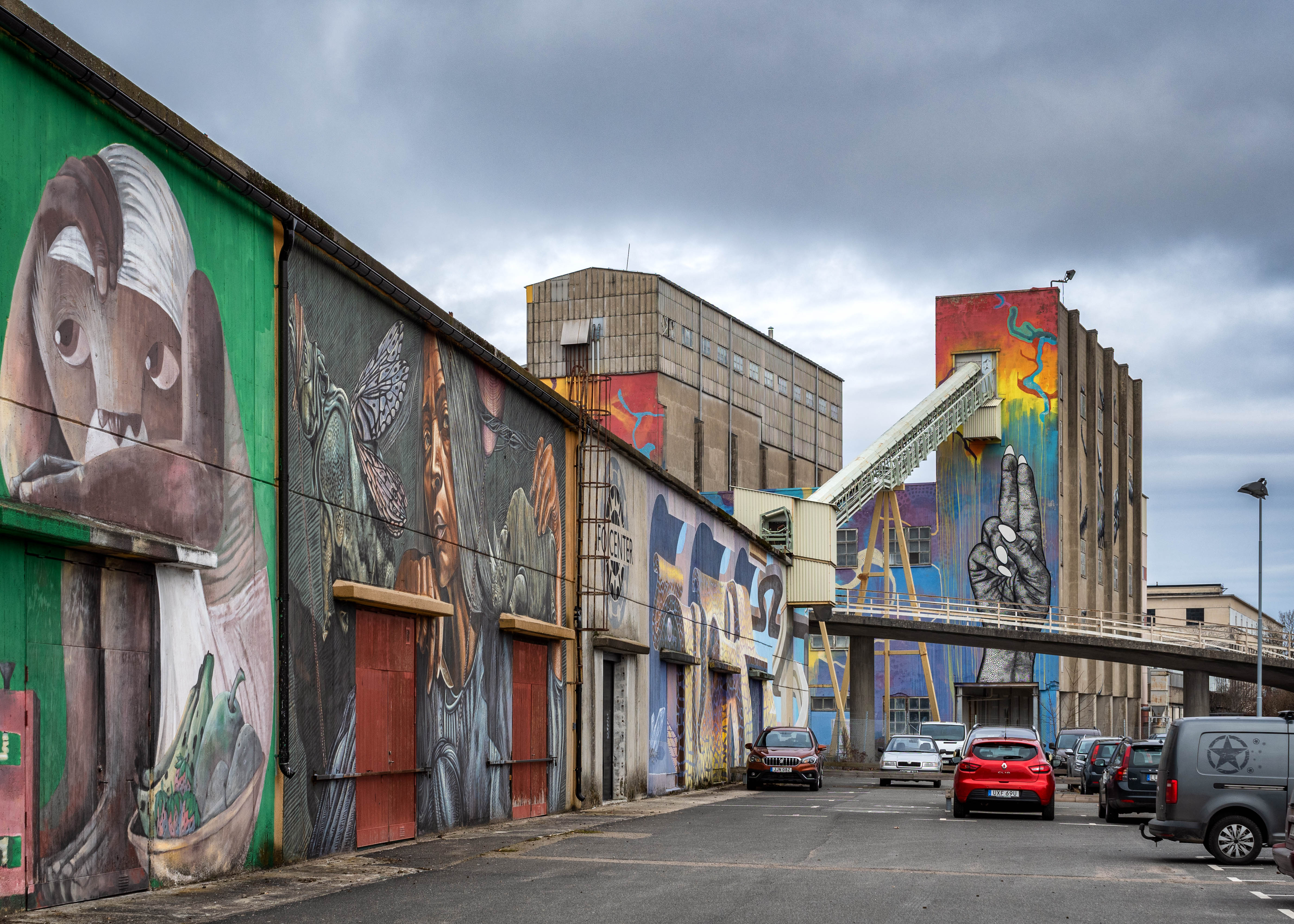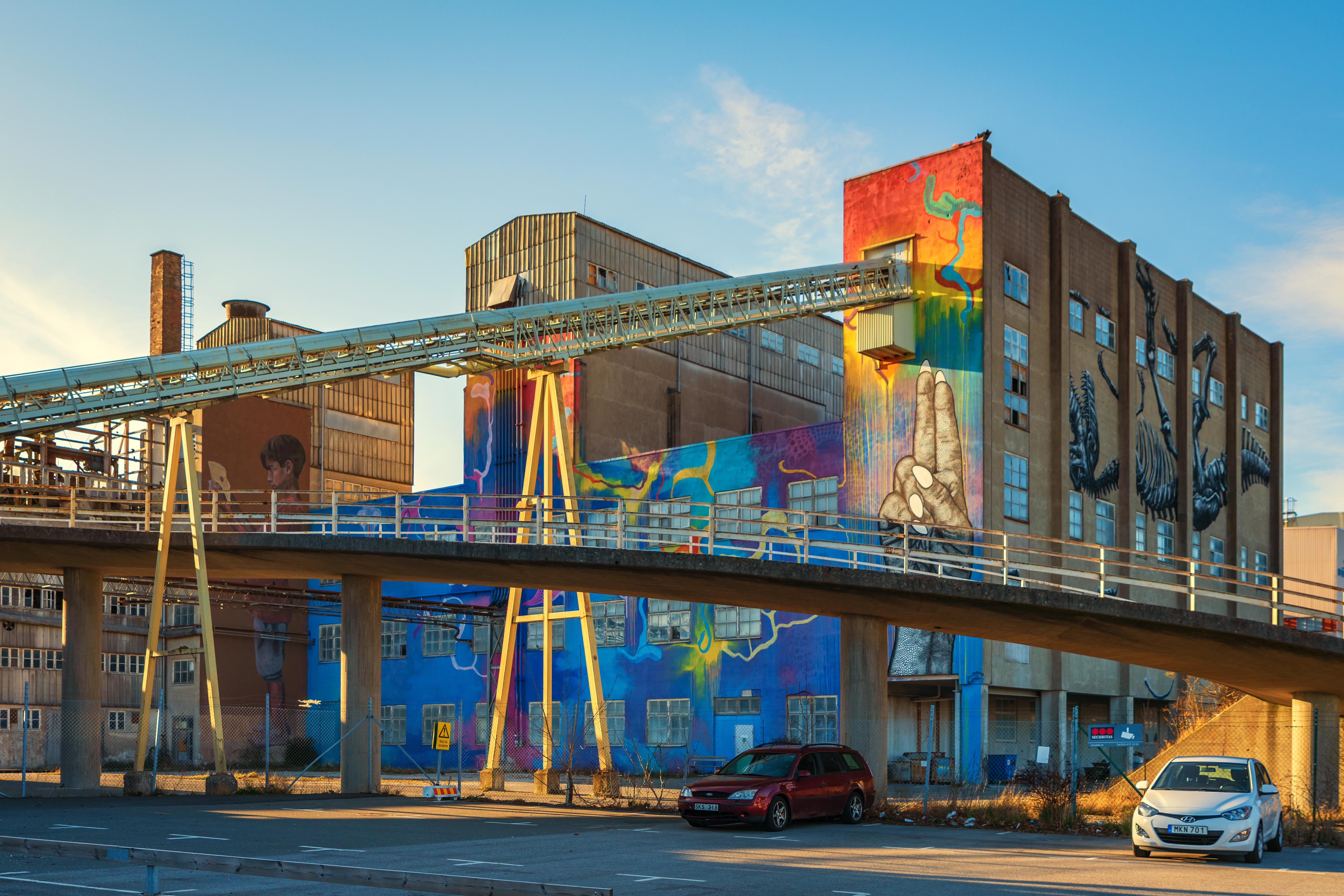 Utanför bild på väggen till vänster finns mandalan i förra inlägget. Här syns längst till vänster en del av en väggmålning av Tiago Gomes. Därefter en målning av Vera Bugatti (en del av den ser du på bilden här under) och därefter en målning av Wild Drawing. I bakgrunden väggmålningar av Carolina Falkholt. Allt finns på IFÖ-verkens gamla fabriksbyggnader i Bromölla.