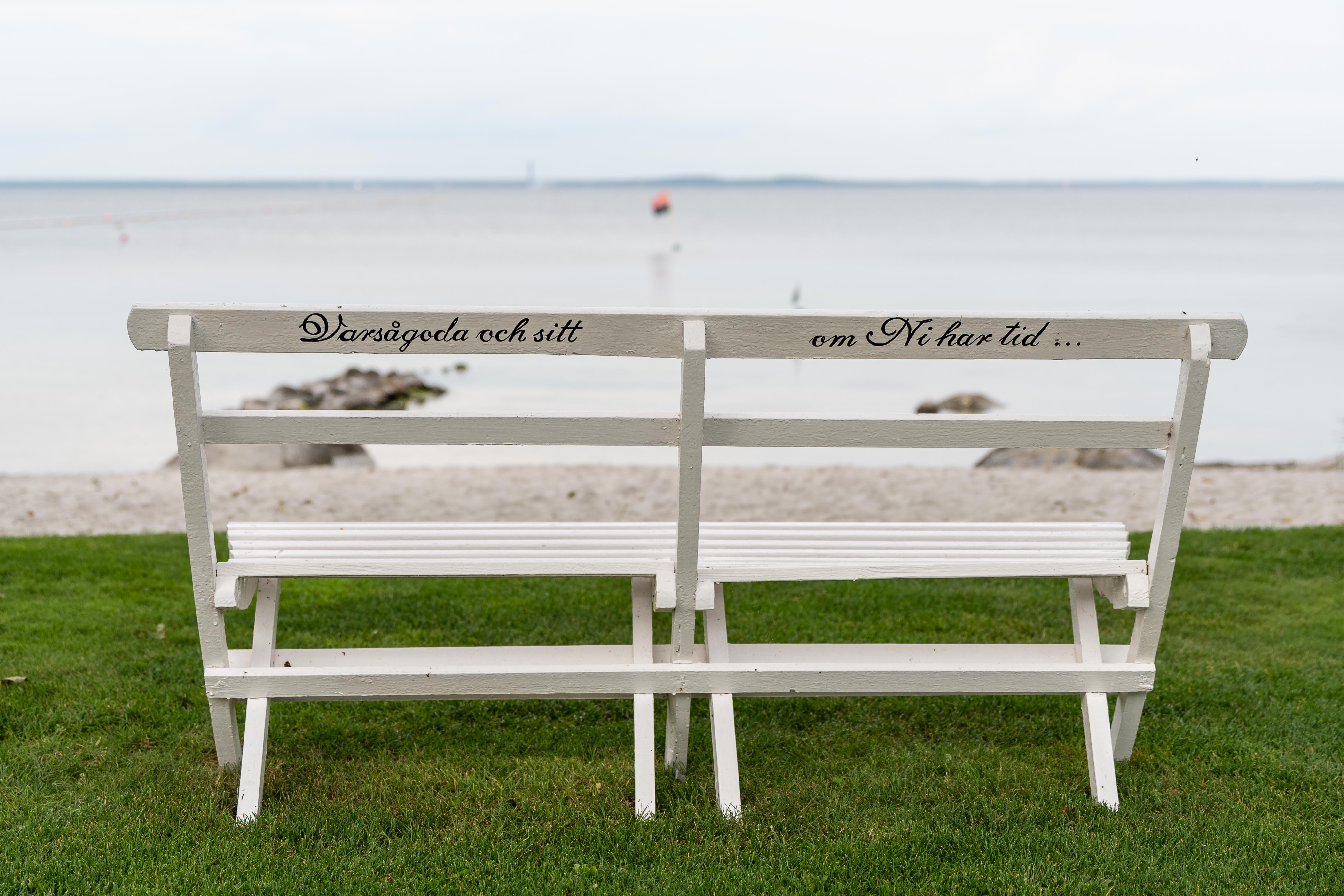 Texten är på listerländsk dialekt och kan översättas med lat-hund-sanden. Bänken står vänd så man har utsikt över en sandstrand. Enligt en gammal fiskare, som jag pratade med, så sköttes stranden förr väldigt noggrannt hela sommaren, rensades från tång och sjögräs med mera. Men den sköts inte lika bra nu och därför kallar han den lat-hund-sanden 🙂