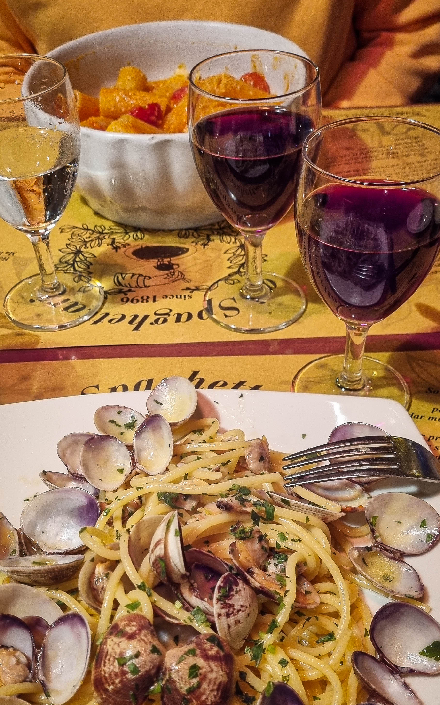 ”Spaghetti alle vongole veraci” och ”Rigatoni alla pecorara” med ett glas rött 🙂
