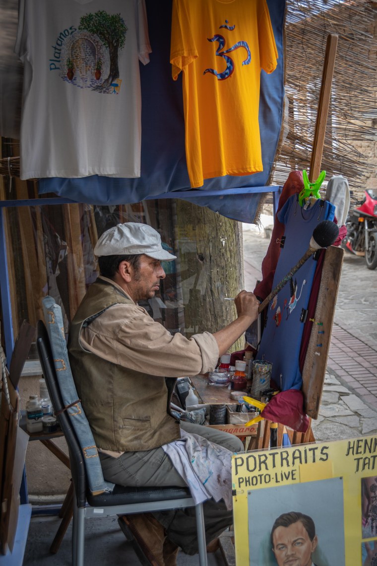 Den här mannen satt och målade t-shirtar i Platanos, den högsta bergsbyn på ön. Ett par exempel hänger ovanför honom. Men han gjorde även mycket annat konsthantverk och porträttmålning som synes. Han påstod att färgen var tvättäkta och skulle hålla i flera år. Jag vill minnas att priset låg någonstans mellan 200 och 300 kronor. När vi kom dit en andra gång en vecka senare för att handla av honom, så visade det sig att han tagit ledigt just den dagen, så det blev inget köp 🙂 Rygg mot rygg? Ja, hans rygg mot stolsryggen 🙂