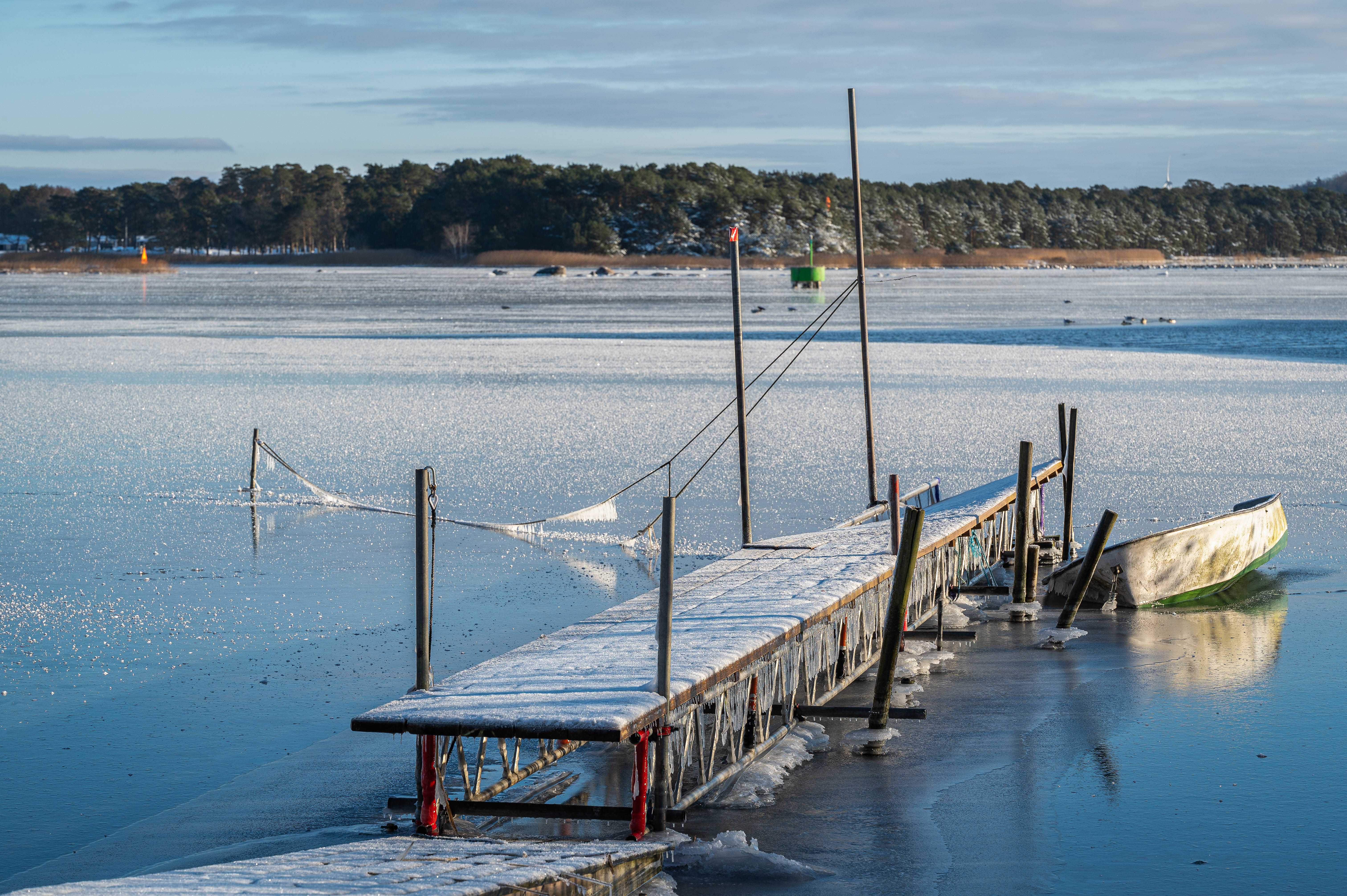 Efter ett par dagar med minusgrader, åtminstone nattetid, kom det igår kväll och i natt omkring en decimeter snö här. Men denna bilden är från mitten av januari. Nu har det inte hunnit bli någon is på viken och den lilla snön som kom lär försvinna söndag-måndag då det ska regna och på nytt bli temperaturer omkring 8-10 plusgrader dagtid.