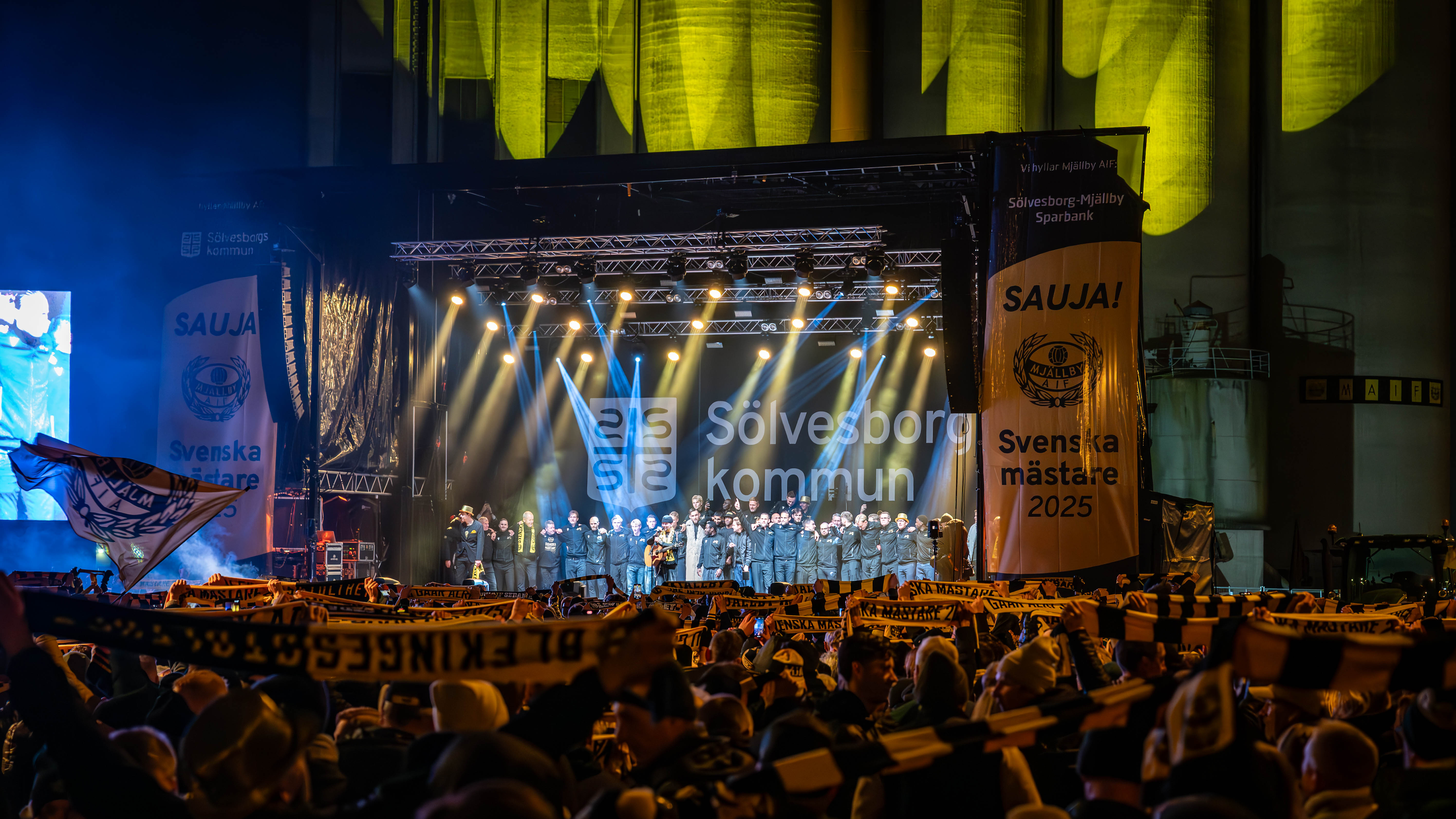 Mjällby AIF hyllades igår efter vinsten i årets fotbollsallsvenska. Laget vann med rekordhöga 75 poäng totalt. Enligt uppgifter i media var ca 7.000 personer samlade och deltog i hyllningarna.