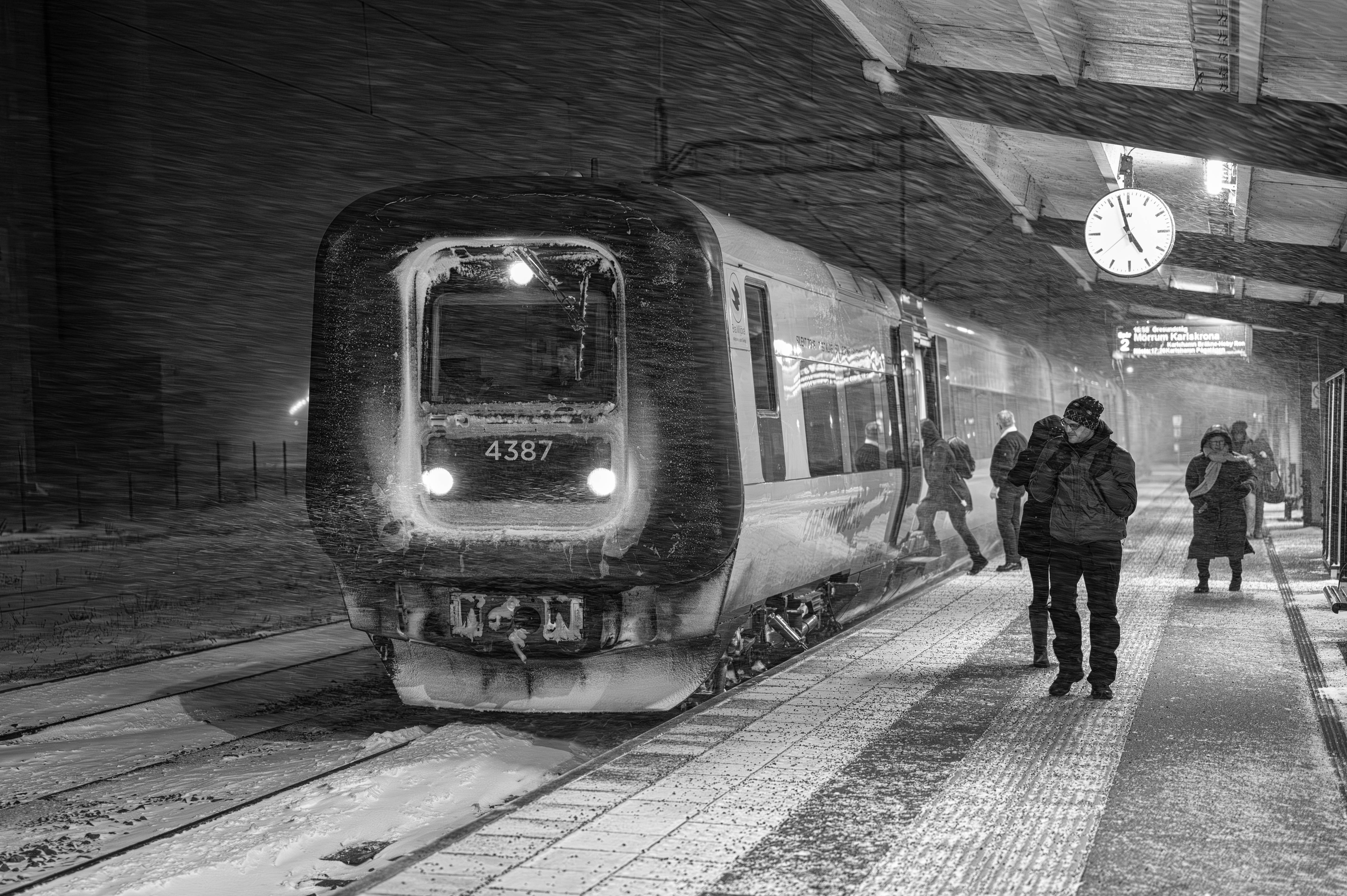 Tåget har precis ankommit till Sölvesborg helt enligt tidtabell trots det besvärliga vädret. Det har snöat kraftigt hela dagen och vindbyarna har ibland haft stormstyrka. Turen har gått hela vägen från Danmark, via Malmö, Burlöv, Lund, Hässleholm, Kristianstad och Bromölla.